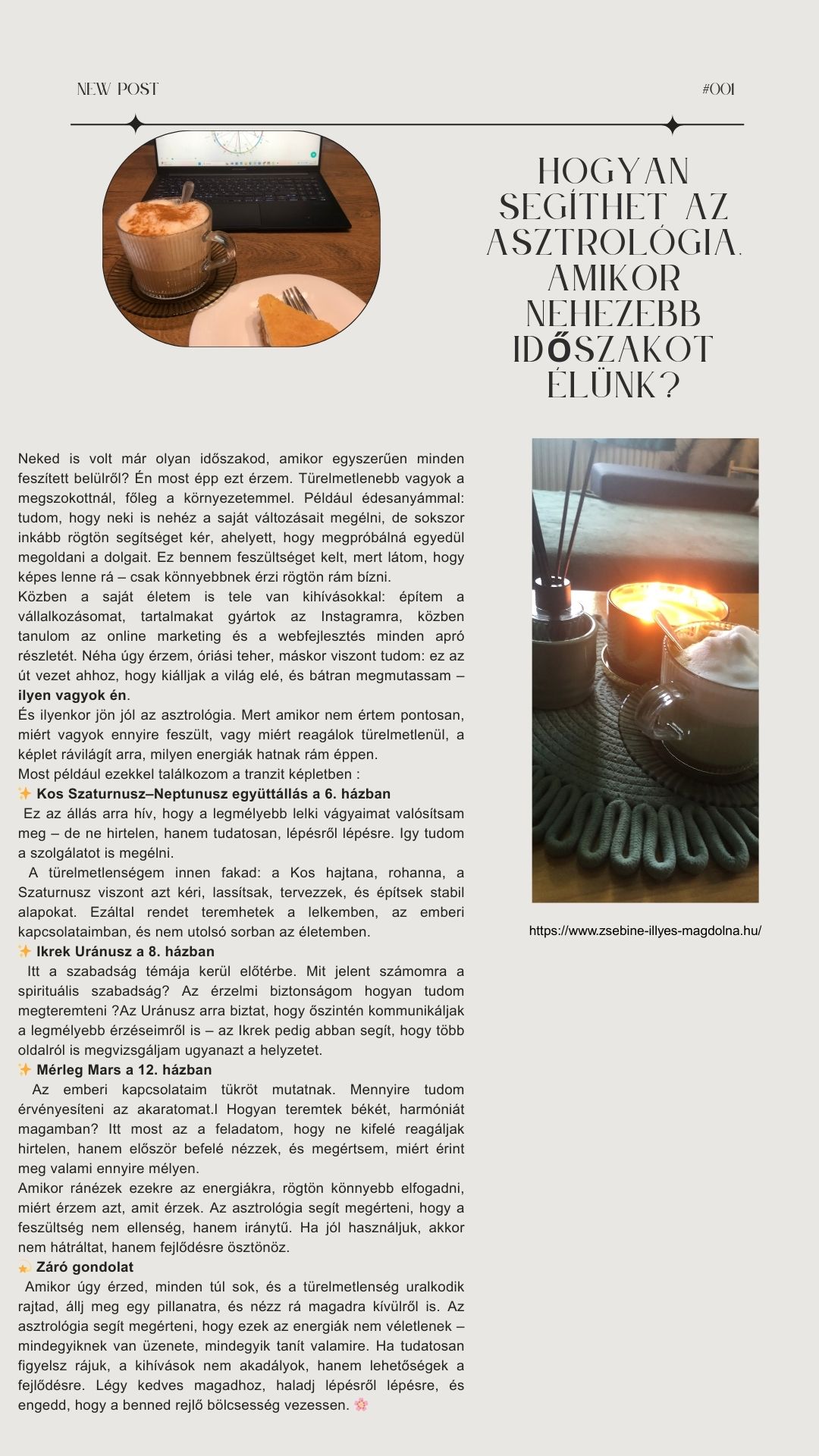 A bolygóid elhelyezkedése (születési horoszkópod szerint) pedig megmutatja, hogy mikor minek van ideje, mi mozgat mostanában, és hogyan tudsz együttműködni a nagy kozmikus hullámzással – nem pedig ellene úszni fejjel a falnak.